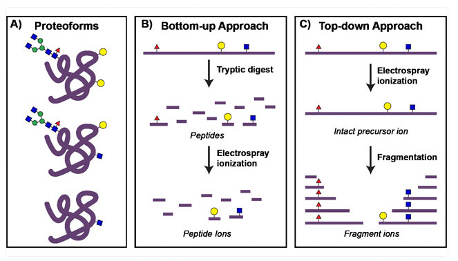 In contrast to top-down IMS, bottom-up imaging mass spectrometry (IMS) incorporates an enzymatic digestion step to analyze peptides rather than intact proteins in situ. In these workflows, a tissue section is treated with a protease—typically trypsin—to cleave proteins into peptides directly on the slide. These peptides, being smaller and more amenable to tandem mass spectrometry (MS/MS) sequencing, produce more identifiable fragment ions than intact proteins, improving protein identification and spatial mapping. While this method enhances the number of proteins detected, it does not retain information on intact protein structures or post-translational modifications as effectively as top-down approaches.