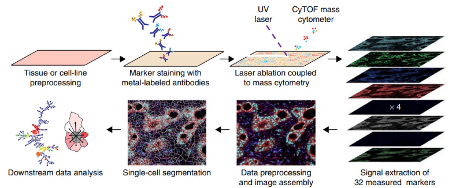 Metal-labeled imaging approaches use antibodies tagged with metal isotopes instead of fluorophores. The readout is performed by mass spectrometry, allowing dozens of different metal tags to be detected in parallel without spectral overlap. Two main implementations exist: laser ablation inductively coupled plasma mass spec (Imaging Mass Cytometry, CyTOF-based) and ion beam imaging mass spec (MIBI).